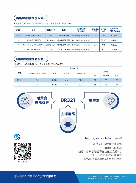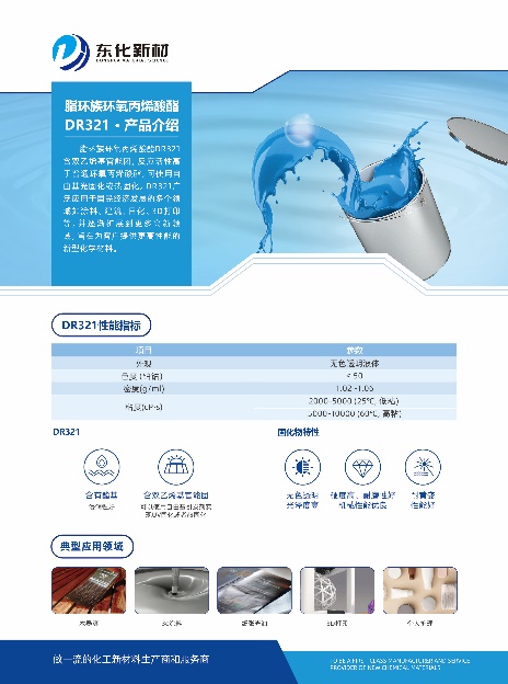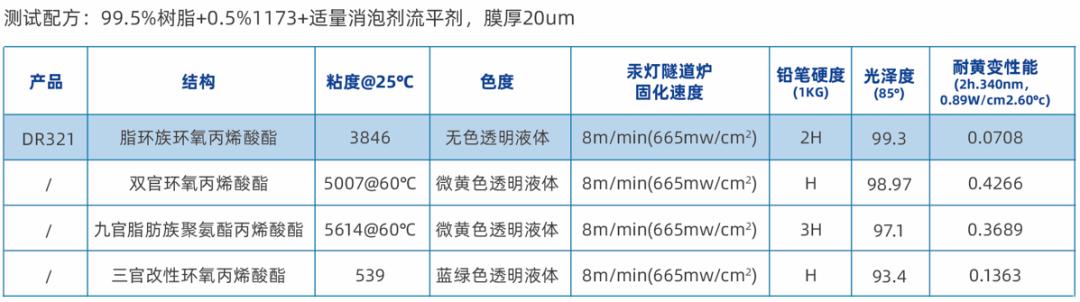 目前諸多(duō)應用(yòng)領域,如($•rú)木(mù)器(qì)漆面漆,選用(yòng÷₹)聚氨酯/丙烯酸酯成本較高(gāo),普通(tōng)的(de$δ₹)環氧丙烯酸酯耐黃(huáng)變性較差。東$ ↑(dōng)化(huà)推出脂環族環氧改性的("↔αde)丙烯酸酯321,具有(yǒu)低(dī)粘度、固化(huà)速度快(kuài)、ε₽π耐黃(huáng)變優異、光(guāng)澤度高(gāo)等突出優☆點,具體(tǐ)可(kě)以詳見(jiàn)對(duì)↓比數(shù)據: