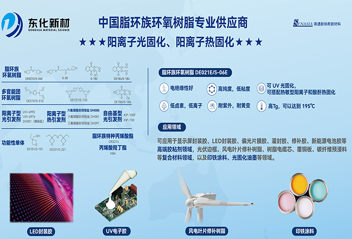 東(dōn"£g)化(huà)新材攜多(duō)款脂環族環氧樹(shù)脂明(míng)>♠星産品亮(liàng)相(xiàng)大↕"←(dà)會(huì),憑借低(dī)鹵素、耐黃(huáng)變、可(kě)Uπ>V光(guāng)固化(huà)/熱(rè)固化(huà)等優勢≤ ÷,可(kě)應用(yòng)于顯示屏封裝膠、LE↕¥¶D封裝膠、偏光(guāng)片膜膠、灌封•λ>膠、修補膠、新能(néng)源電(diàn)池膠等高(gāo)端 δ×膠粘劑領域,以及光(guāng)伏邊框、風×¶↕↑(fēng)電(diàn)葉片修補樹(shù)脂、樹(shù)脂電(diàn)纜₽✘芯、覆銅闆、碳纖維預浸料等複合材料領域,以及印鐵(tiě)塗料、光(guāng)固化(huà)油墨∞$★₩等領域。